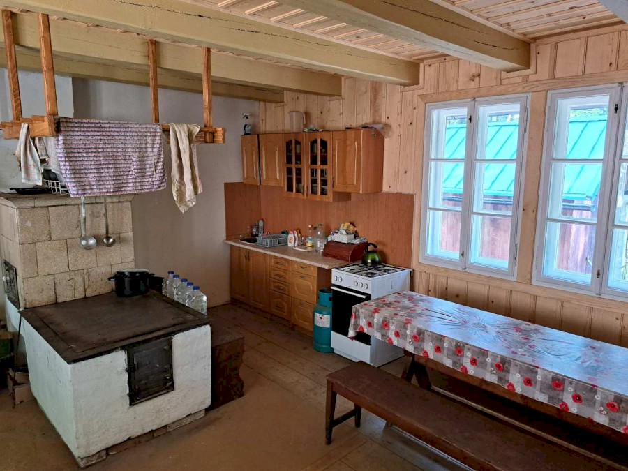 • Kachlový sporák s plotnou a troubou v kuchyni + sporák na propan butan, kuchyň je základně vybavená (nádobí, hrnce, příbory)