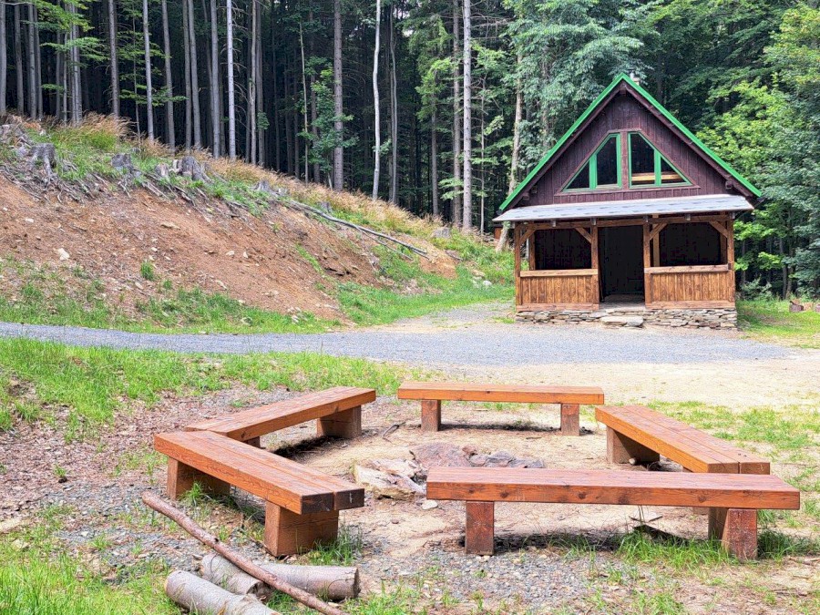 • Venkovní posezení se stolem a lavicemi + venkovní posezení s ohništěm