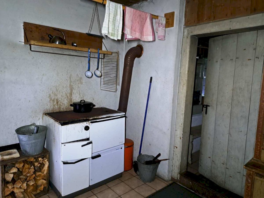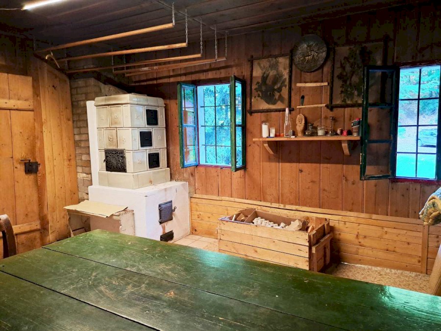 • Kuchyň základně vybavená (nádobí, hrnce, příbory), kachlový sporák s plotnou a troubou