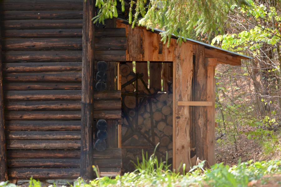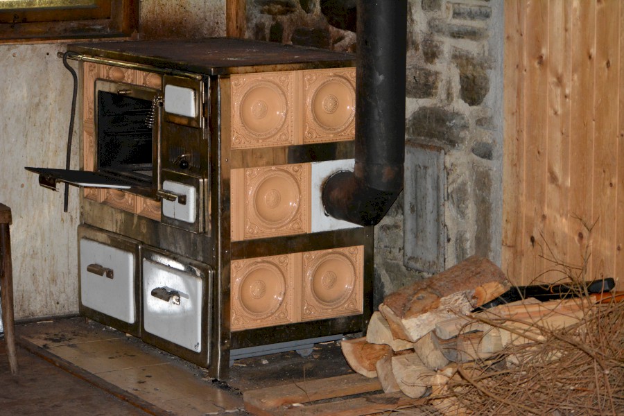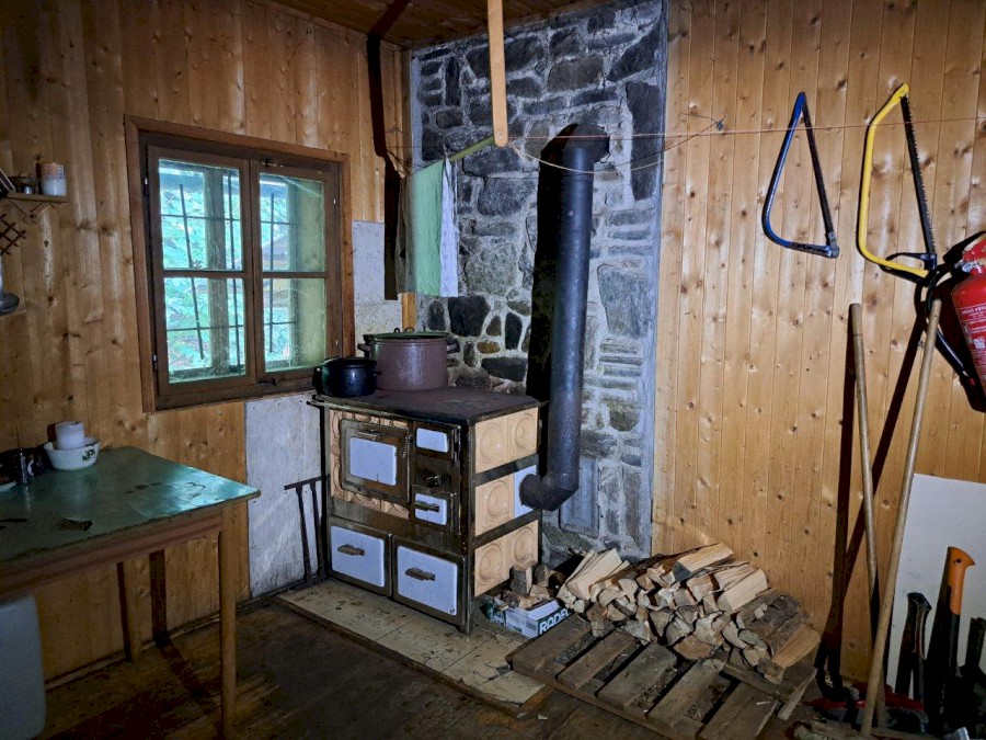 • Vytápění kachlovými kamny s plotnou na vaření (dřevo k dispozici ve dřevníku)