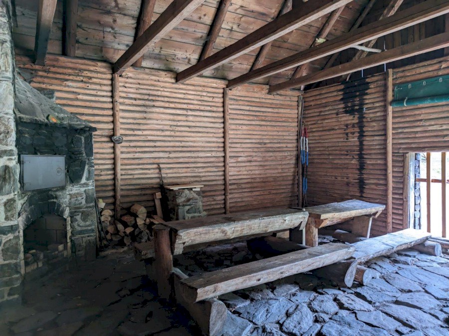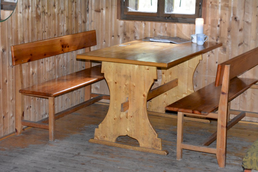 • Kuchyň s jednoduchou linkou, základním vybavením a nádobím, stolem a lavicemi