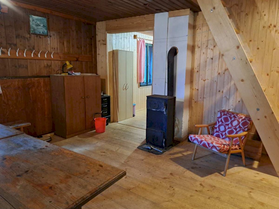 • Obytná místnost s jídelním stolem a kamny na dřevo