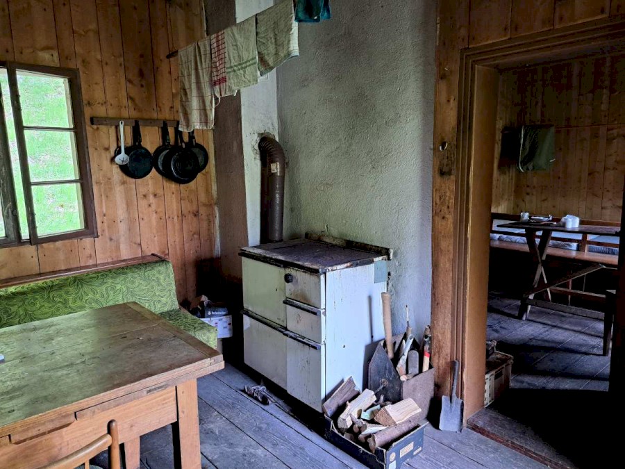 • V kuchyni je kachlový sporák s plotnou a základní vybavení (nádobí, hrnce, příbory)